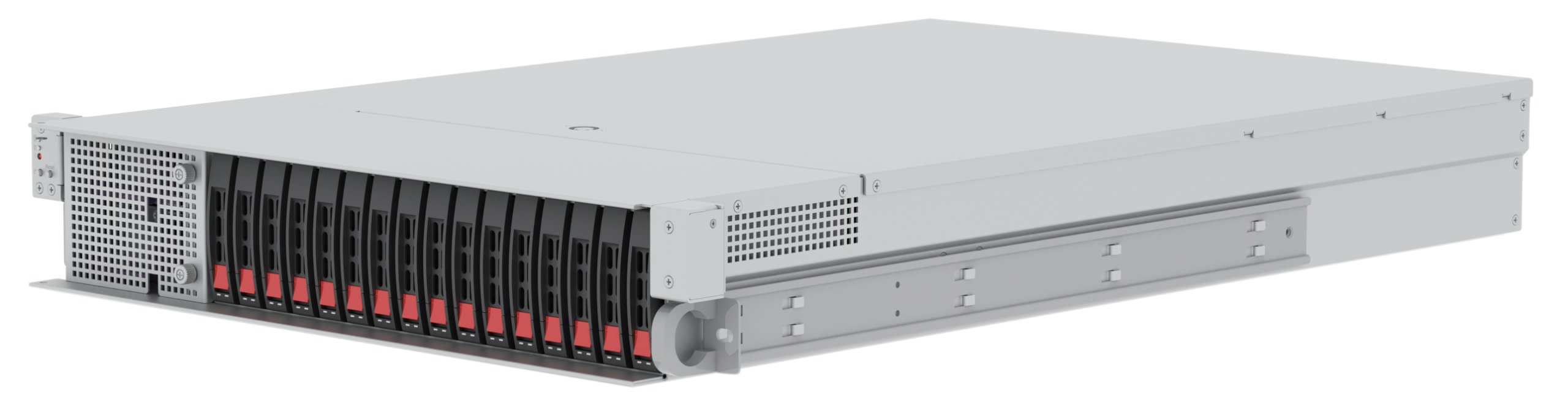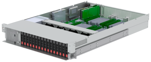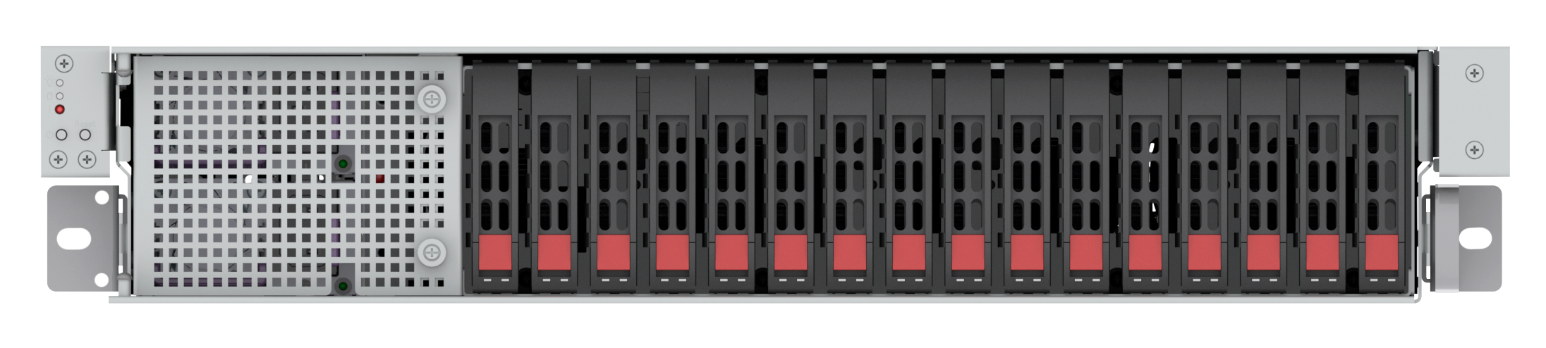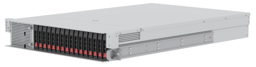 Дисковая подсистема сервера позволяет установку до 16 SAS/SATA дисков 2,5″ (SFF) форм-фактора, поддерживая диски SAS 6/12G и SATA 6G. Каждый диск имеет индикатор работоспособности и неисправности.