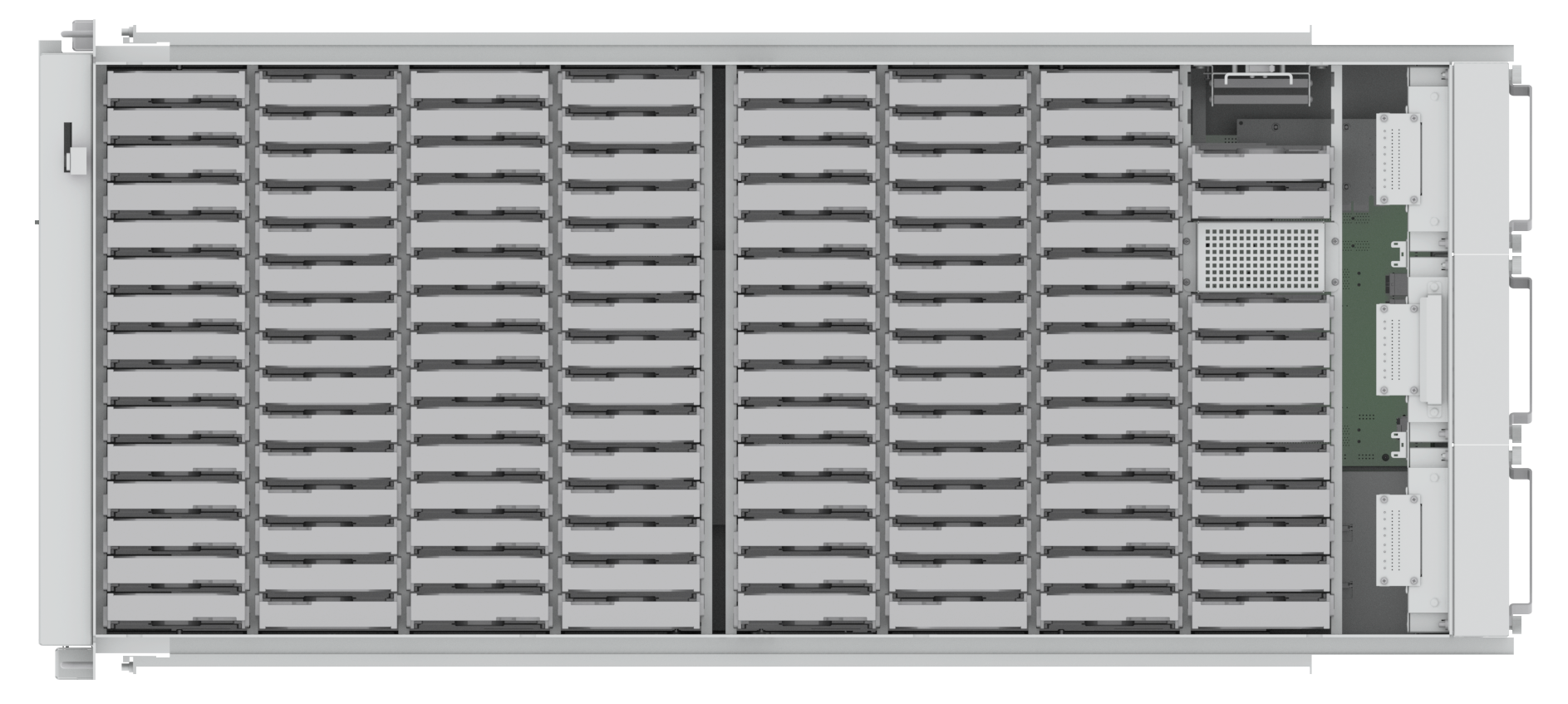 Корпус сервера обладает высокой емкостью, позволяя установку до 124 жестких дисков форм-фактора 3.5″. Инновационные технологии снижения вибрации и контроля тепловыделения обеспечивают надежность системы. Сервер обеспечивает сверхплотное размещение данных и поддерживает интерфейсы Ethernet, RDMA/RoCE, Infiniband.